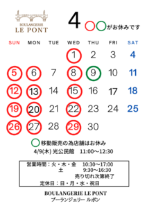 01Apr2026 4月の営業カレンダー 4月の営業カレンダーです。4/9(木)は光公民館移動販売のため、店舗はお休みとなります。木曜日に販売している米粉入り湯種食パンは翌日10日(金)に販売致します。4月もどうぞよろしくお願いします!